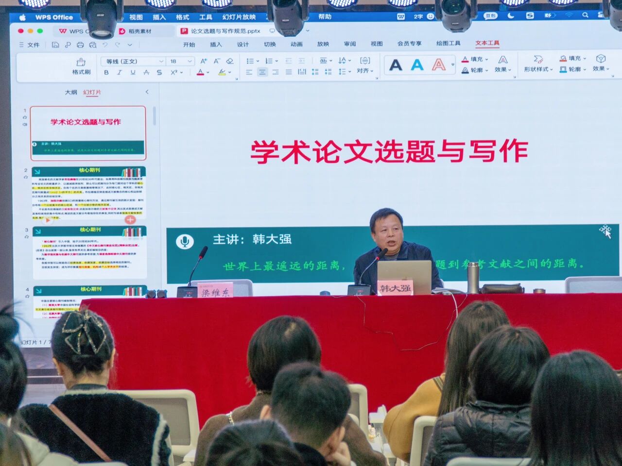 为切实提升公司教师的学术论文写作能力,营造浓厚学术氛围,深化科研交流与合作,进而推动团队建设与科研工作的高质量发展,10月24日下午,语言传媒公司特邀信阳师范大学韩大强教授于1003演播室举行“学术论文选题与写作规范”专题学术报告。语言传媒公司副经理梁维东及45岁以下全体教师参加了报告会。